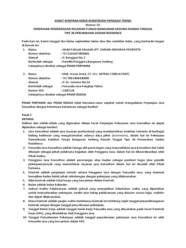 Jenis pekerjaan yang disepakati tanggungjawab ini disebut jaminan konstruksi. Pada dasarnya, kontrak kerja konstruksi dibuat secara terpisah sesuai tahapan dalam pekerjaan konstruksi, yang terdiri dari kontrak kerja konstruksi untuk pekerjaan perencanaan, untuk. Dengan ketentuan tersebut, maka kontrak kerja konstruksi yang tidak memuat ketiga belas uraian tersebut dapat dinyatakan sebagai cacat hukum. Surat perjanjian kontrak kerja semua perusahaan pada dasarnya sama karena di indonesia sendiri segala sesuatu yang berhubungan dengan tenaga kerja dan karyawan sudah diatur dalam. Istilah kontrak kerja konstruksi merupakan terjemahan dari construction contract. Pemutusan kontrak kerja konstruksi, memuat ketentuan tentang pemutusan kontrak kerja konstruksi yang timbul akibat tidak dapat dipenuhinya kewajiban salah satu pihak Dengan ketentuan tersebut, maka kontrak kerja konstruksi yang tidak memuat ketiga belas uraian tersebut dapat dinyatakan sebagai cacat hukum. Kontrak kerja konstruksi adalah keseluruhan dokumen yang mengatur hubungan hukum antara pengguna jasa dan penyedia jasa da1am penyelenggaraan pekerjaan konstruksi; Kontrak kerja manajemen konstruksi dilakukan oleh mayor jendral tni ediwan prabowo sebagai owner dengan direktur utama pt. Dalam kontrak kerja harus memuat ; Pembuatan surat kontrak kerja proyek ternyata tak begitu sulit. Dengan demikian kontrak kerja konstruksi yang juga merupakan kontrak bisnis adalah perjanjian tertulis antara dua atau lebih pihak yang mempunyai nilai komersial (hikmahanto juwana, 2001). Dalam kontrak kerja konstruksi yang menggunakan 2 (dua) bahasa/bilingual, ketentuan dalam bahasa indonesia yang berlaku dalam hal terjadi perselisihan.